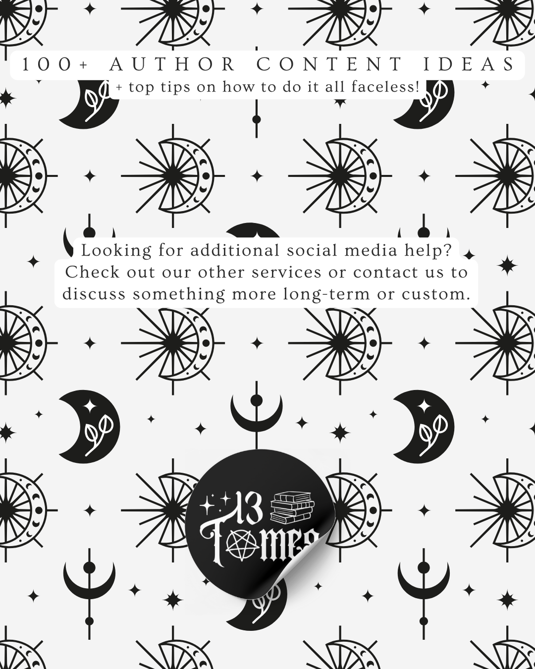 PDF download with 100+ author content ideas and top 10 tips on how to stay faceless. Download and print so you can check off each idea as you use it.