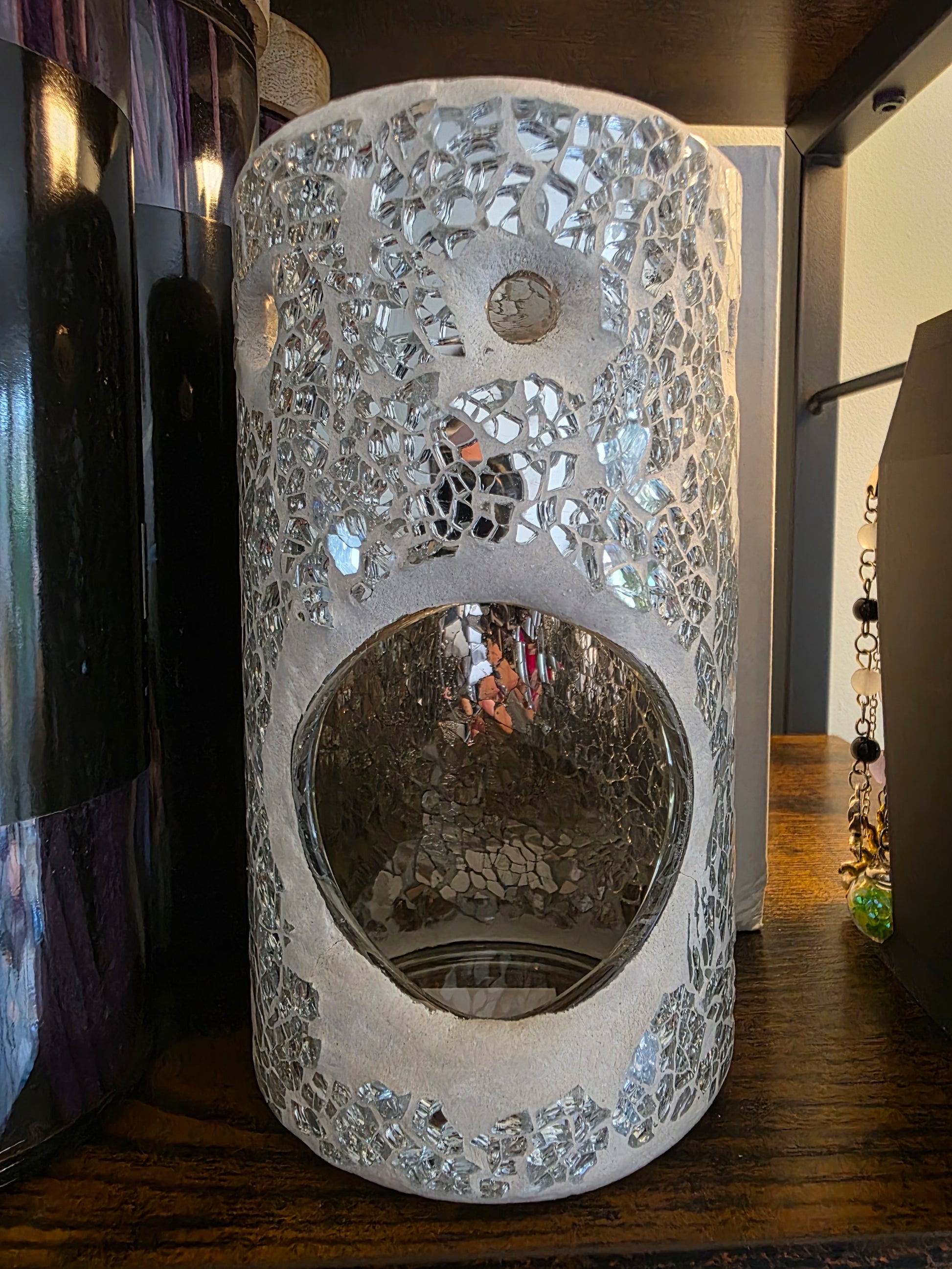 Stunning pillar shaped oil burner with a silver mirrored crackle effect. Would look beautiful in any home. This item can also be used as a wax melt burner however it is advisable to consider the size and depth of the bowl when adding wax to ensure it will not overrun the edges when melted.