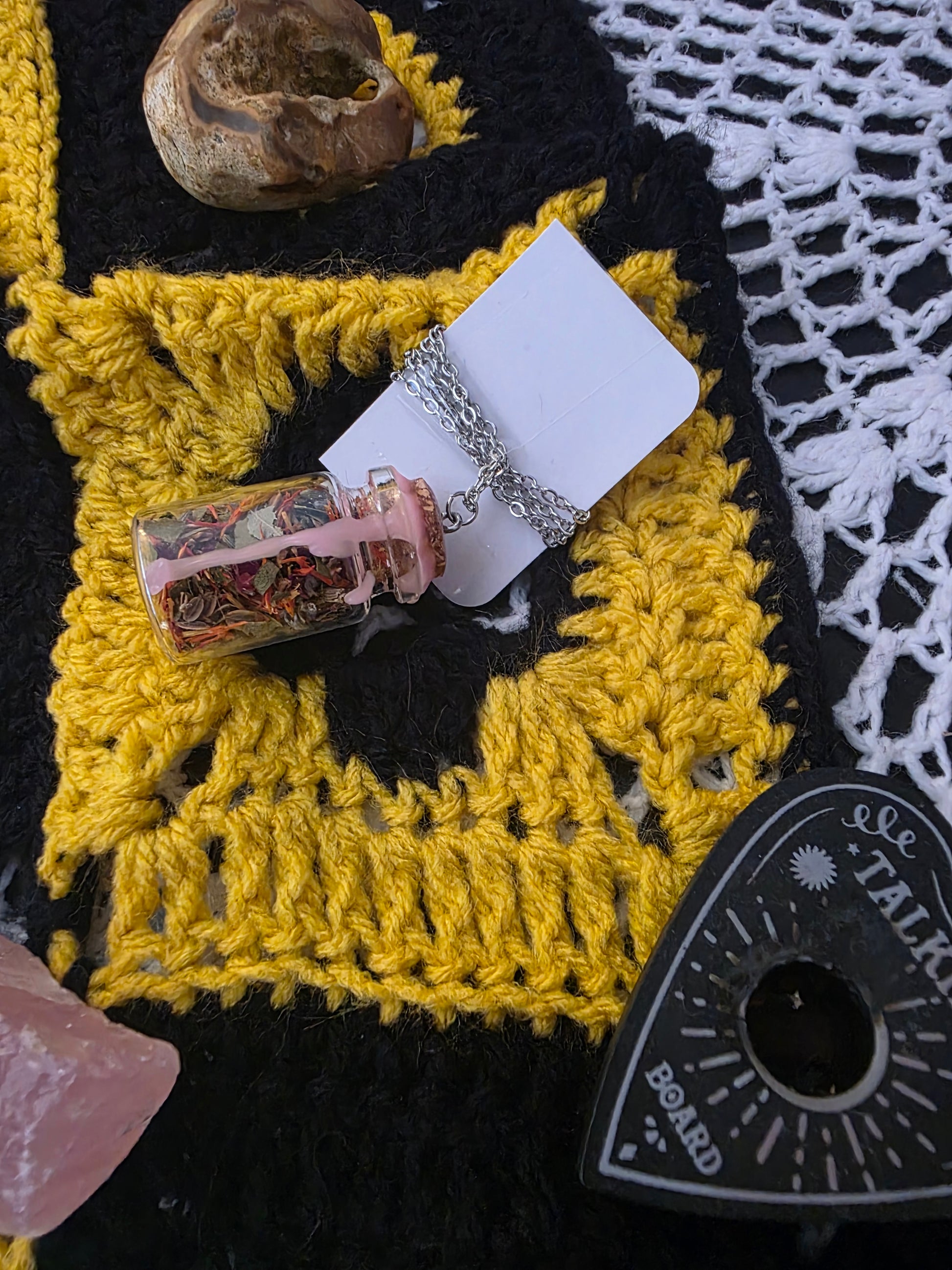 Beautiful handmade spell jar necklace with varying properties. Containing herbs or crystals.