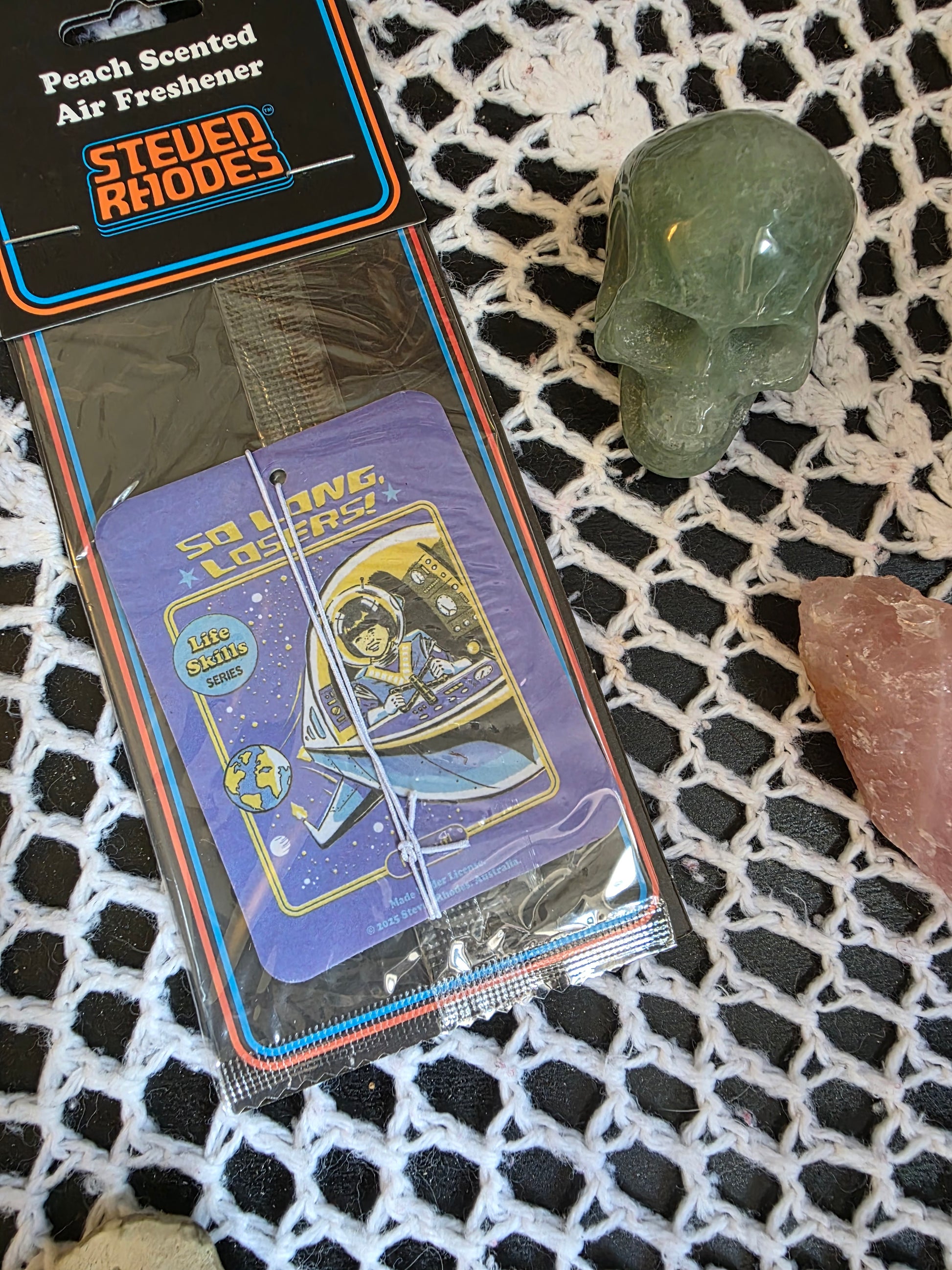 This Steven Rhodes air freshener set includes peach, apple and vanilla scents paired with existential dread and retro chaos. Officially licensed and part of the Steven Rhodes collection of iconic retro gifts.